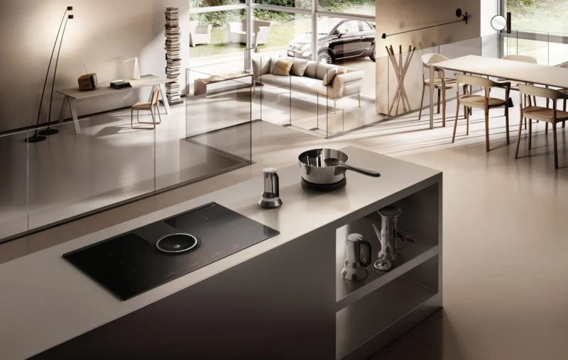 - Thiết kế tích hợp độc đáo, tối ưu không gian: Là sự kết hợp hoàn hảo giữa bếp từ và hút mùi downdraft với thiết kế họng hút trung tâm, bếp Nikolatesla ONE HP mang lại vẻ đẹp liền mạch, hiện đại cho không gian bếp, đặc biệt là các đảo bếp, loại bỏ sự cồng kềnh của máy hút mùi truyền thống.