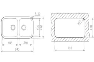 - Kích thước hộc rửa 2 (R x D x S): 340 x 406 x 180 mm