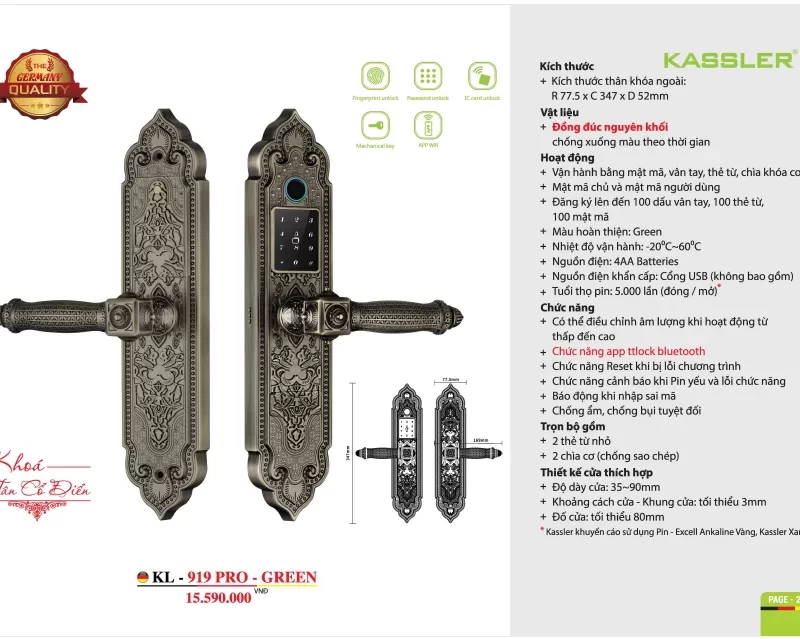 THÔNG SỐ KỸ THUẬT CỦA KHOÁ CỬA GỖ TÂN CỔ ĐIỂN KASSLER KL 919 PRO GREEN APP WIFI
