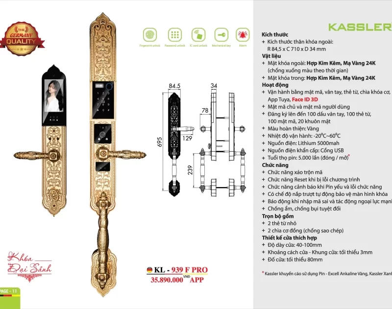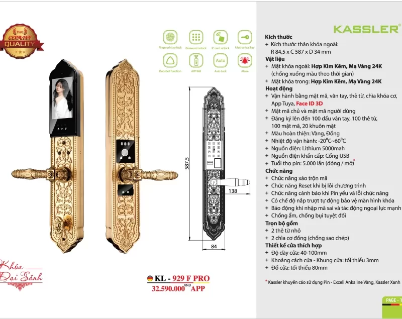 THÔNG SỐ KỸ THUẬT CỦA KHOÁ VÂN TAY KASSLER KL 929 F PRO GOLD APP CHỐNG MƯA
