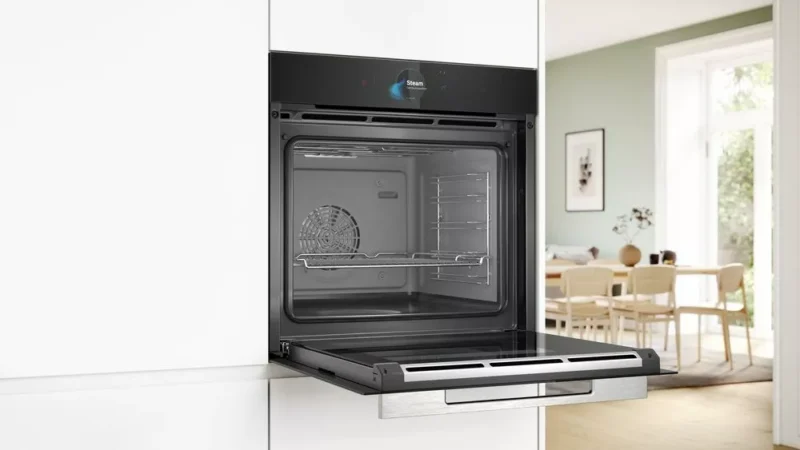Thiết kế Serie 8 Cao Cấp: Thiết kế âm tủ sang trọng với mặt kính đen tuyền, phù hợp với mọi không gian bếp hiện đại. Cửa lò có cơ chế SoftOpen & SoftClose (đóng mở êm ái), tăng độ bền và tính tiện nghi.