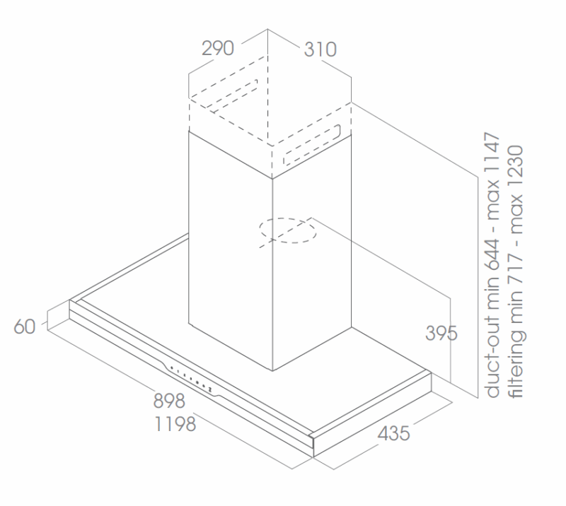 - Kích thước: Chiều rộng: 90 cm x Chiều sâu: 43.5 cm x Chiều cao: Từ 64.4 cm –123 cm (tùy thuộc vào lắp đặt ống khói).