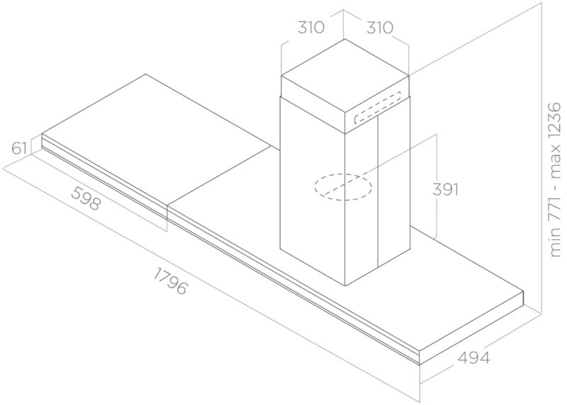 - Kiểu dáng: Máy hút mùi đảo bếp, dạng khối hộp chữ nhật treo độc lập, thiết kế tối giản, hiện đại.