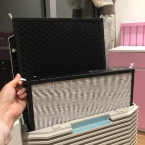- Màng lọc HEPA (MERV 17): Loại bỏ 99.97% bụi mịn PM2.5, vi khuẩn, virus, nấm mốc, phấn hoa và các tác nhân gây dị ứng. Diện tích màng lọc lớn (3.6 m² với 100 nếp gấp).