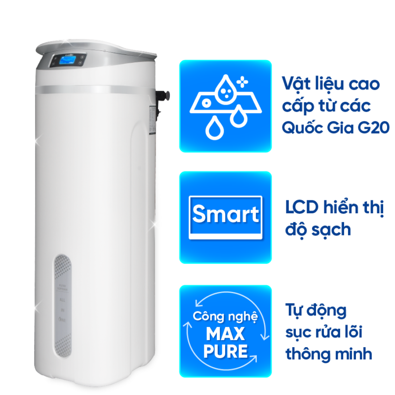 - Bao gồm cột lọc MaxClean than hoạt tính và cột làm mềm MAX SOFT, mang lại hiệu quả lọc toàn diện.