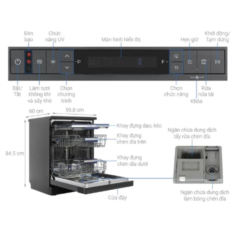 - Chức năng rửa nửa tải, tăng tốc độ rửa, hẹn giờ, báo mức muối và chất tẩy rửa, bảo vệ chống tràn, rò rỉ nước và khóa trẻ em, mang lại sự tiện lợi và an toàn tối đa.
