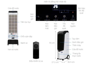- Thiết kế linh hoạt và tiện lợi: Quạt có bánh xe di chuyển dễ dàng, cho phép người dùng thay đổi vị trí sử dụng linh hoạt giữa các phòng. Bình chứa nước 14 lít cung cấp thời gian hoạt động liên tục khá dài.