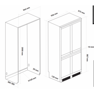 - Kích thước âm tủ (Rộng x Sâu x Cao): 963R x Min580S x 1999C mm (một số nguồn ghi 964R x Min580S x 2000C mm).