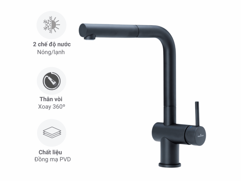 - Điểm nhấn thẩm mỹ độc đáo: Vòi Reginox Cedar Mạ Đen HMH.R31643 là một lựa chọn hoàn hảo để tạo nên sự khác biệt và đẳng cấp cho không gian bếp. Lớp mạ đen PVD mang đến vẻ ngoài sang trọng, hiện đại và rất cá tính, phù hợp với các thiết kế bếp tối giản, công nghiệp hoặc cần điểm nhấn mạnh mẽ.