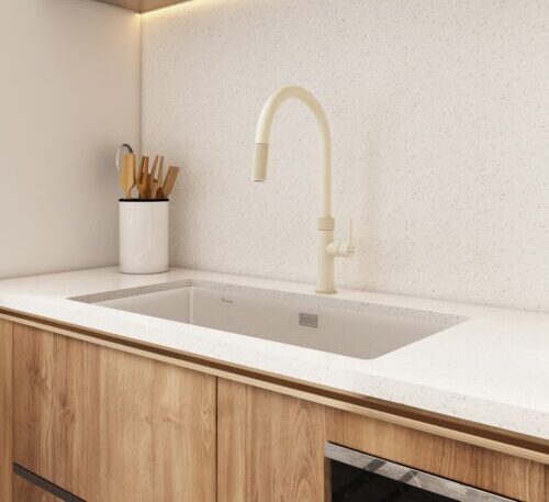 Thiết kế Màu Nude Độc đáo: Màu Nude/Hồng đất tạo nên vẻ đẹp tinh tế, sang trọng và rất thời thượng, dễ dàng kết hợp với các loại chậu đá hoặc mặt bếp tông màu sáng, tạo điểm nhấn ấm áp, hiện đại.